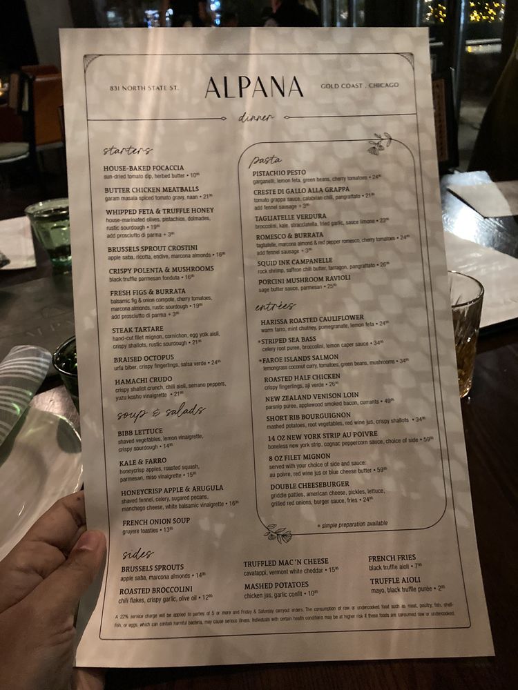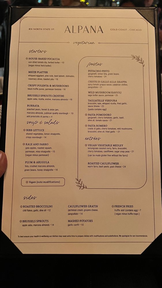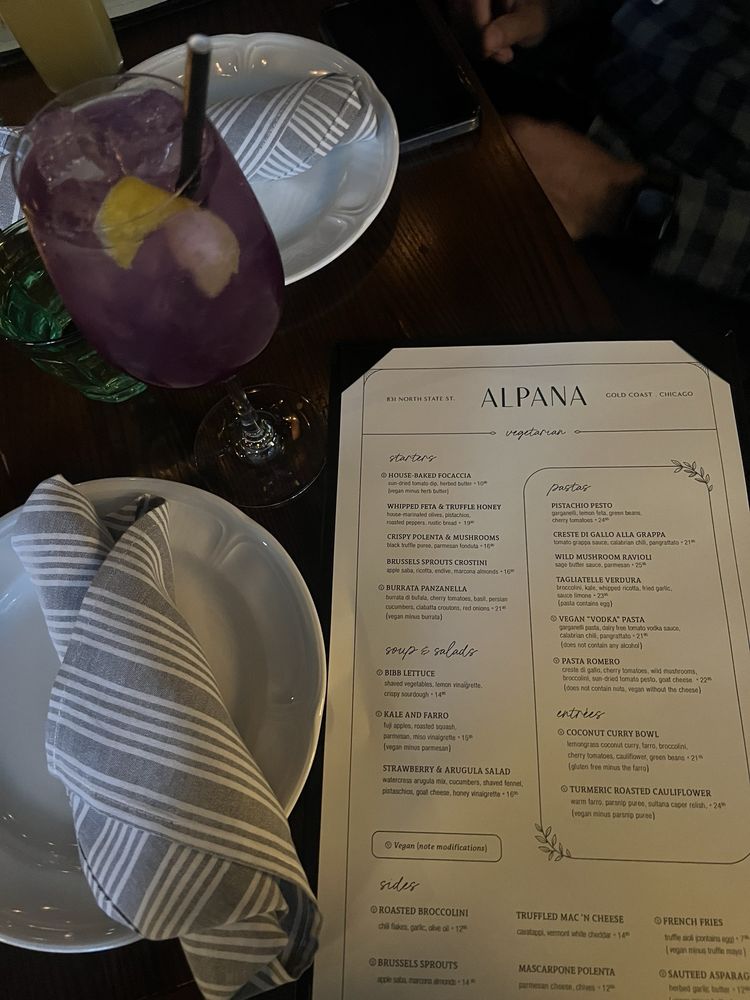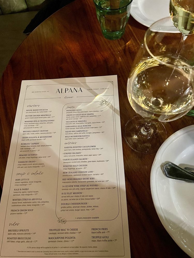 Welcome to Alpana, a trendy wine bar located in Chicago's upscale River North neighborhood. With a focus on New American cuisine, Alpana offers a wide range of options for diners, including pescatarian and vegan dishes. The restaurant provides a classy and romantic ambiance, perfect for dinner or special occasions. From unique cocktails to exquisite dishes, Alpana's menu is curated to appeal to a variety of palates.