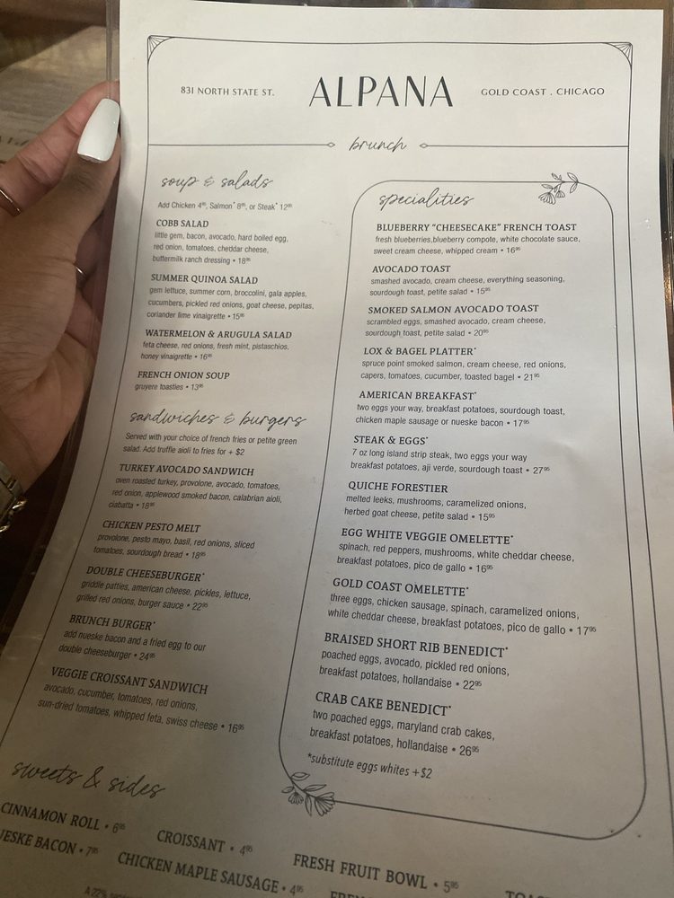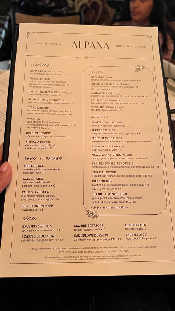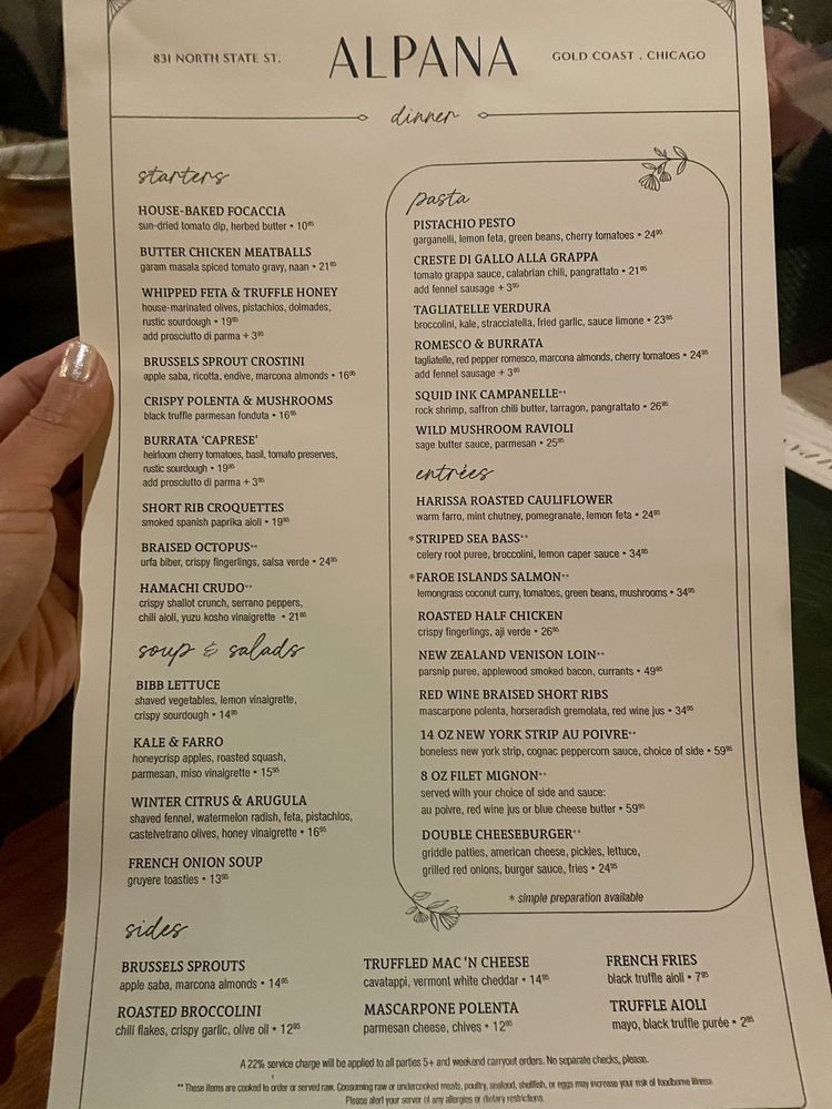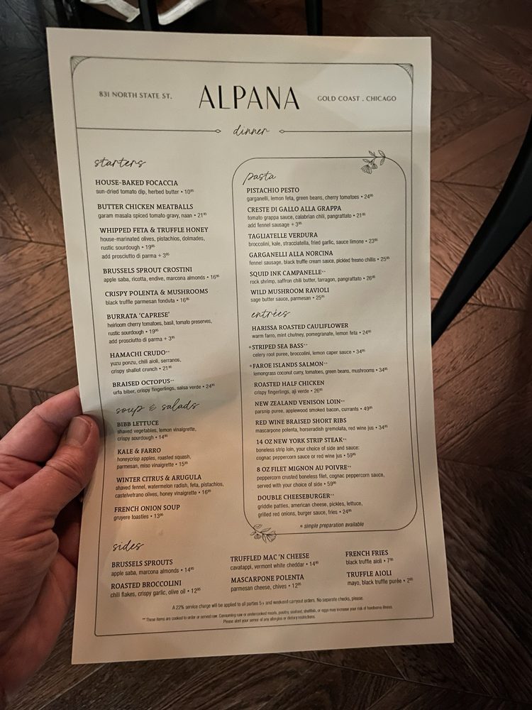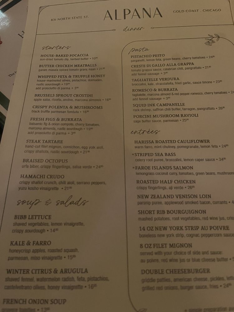 Welcome to Alpana, a trendy wine bar located in Chicago's upscale River North neighborhood. With a focus on New American cuisine, Alpana offers a wide range of options for diners, including pescatarian and vegan dishes. The restaurant provides a classy and romantic ambiance, perfect for dinner or special occasions. From unique cocktails to exquisite dishes, Alpana's menu is curated to appeal to a variety of palates.